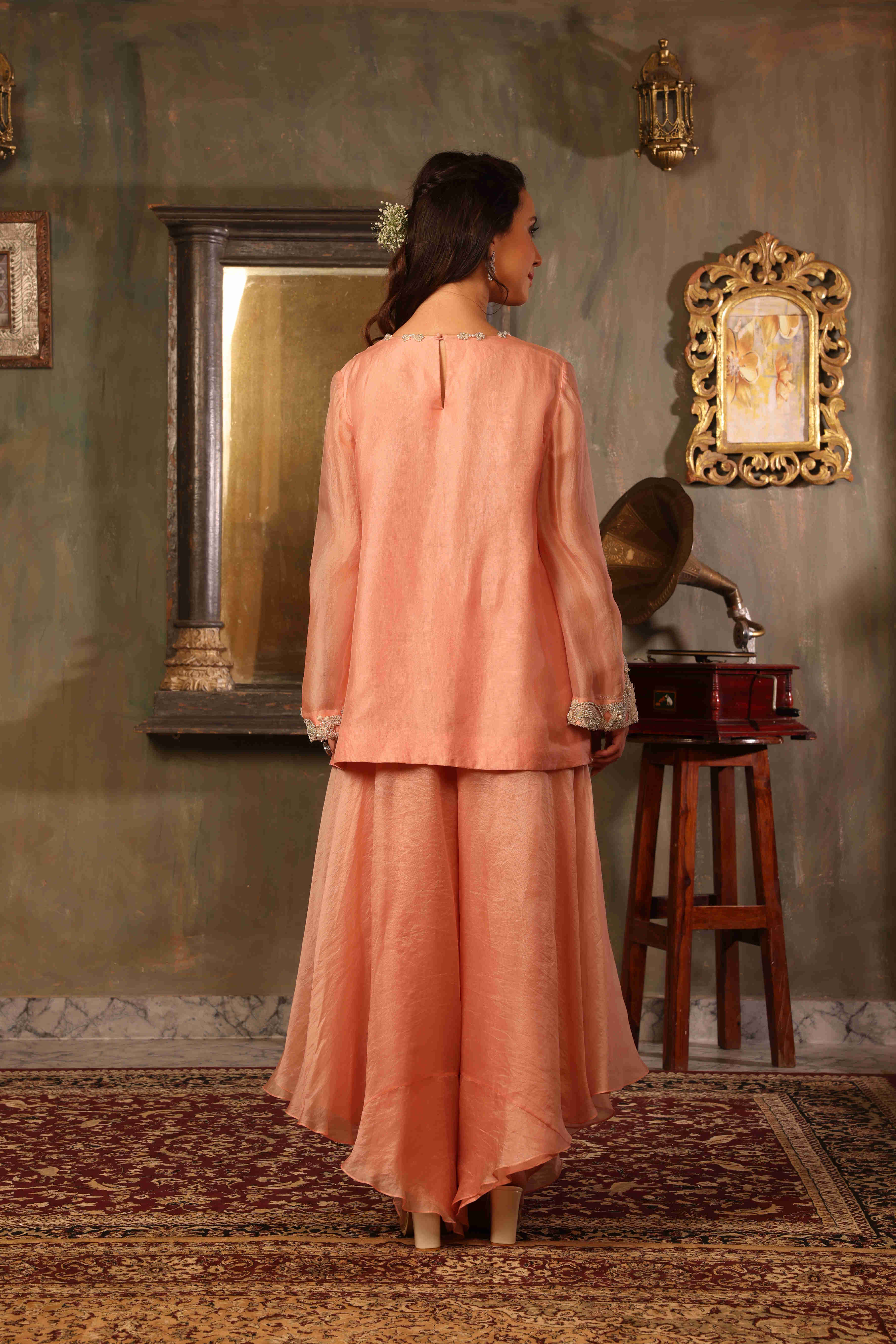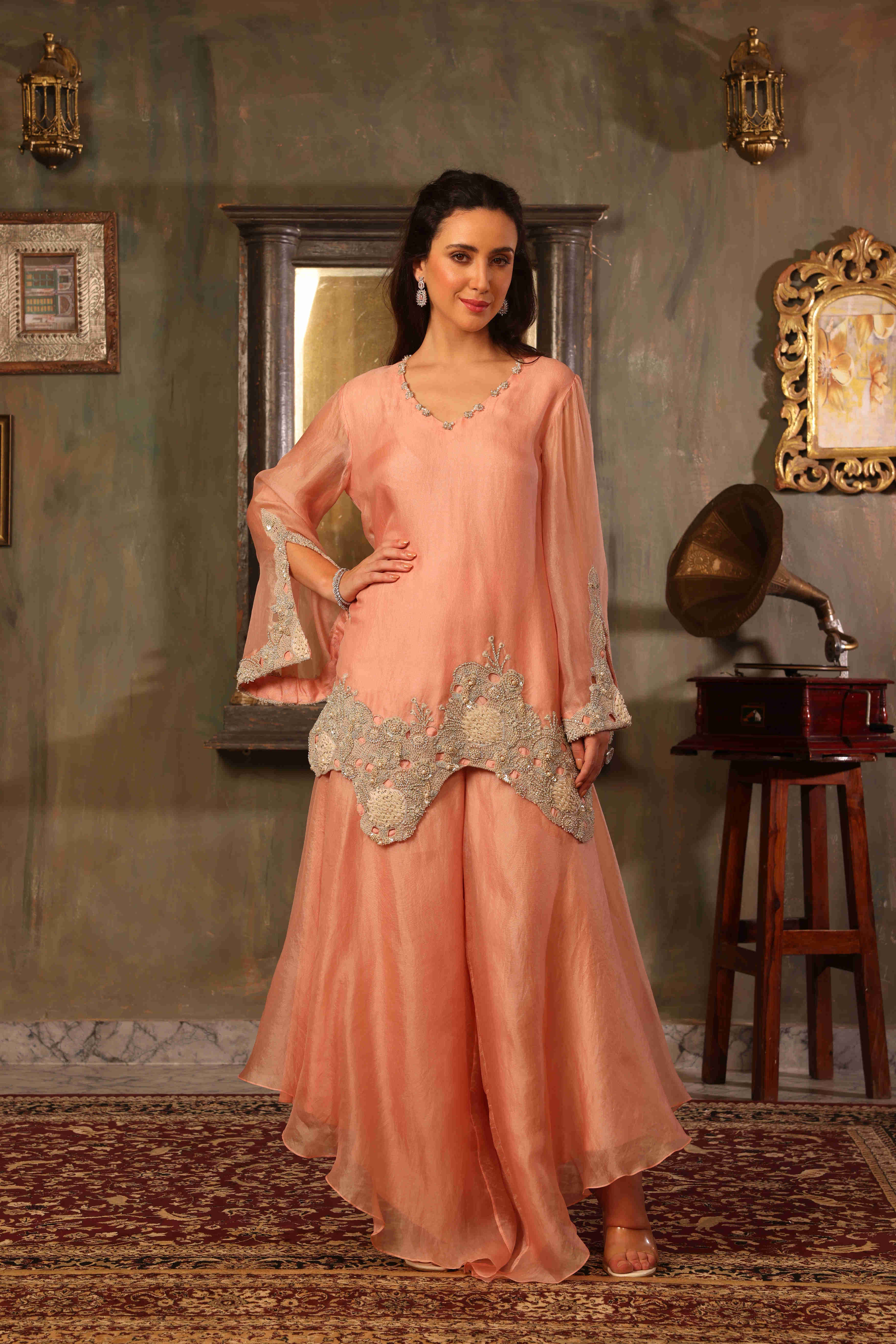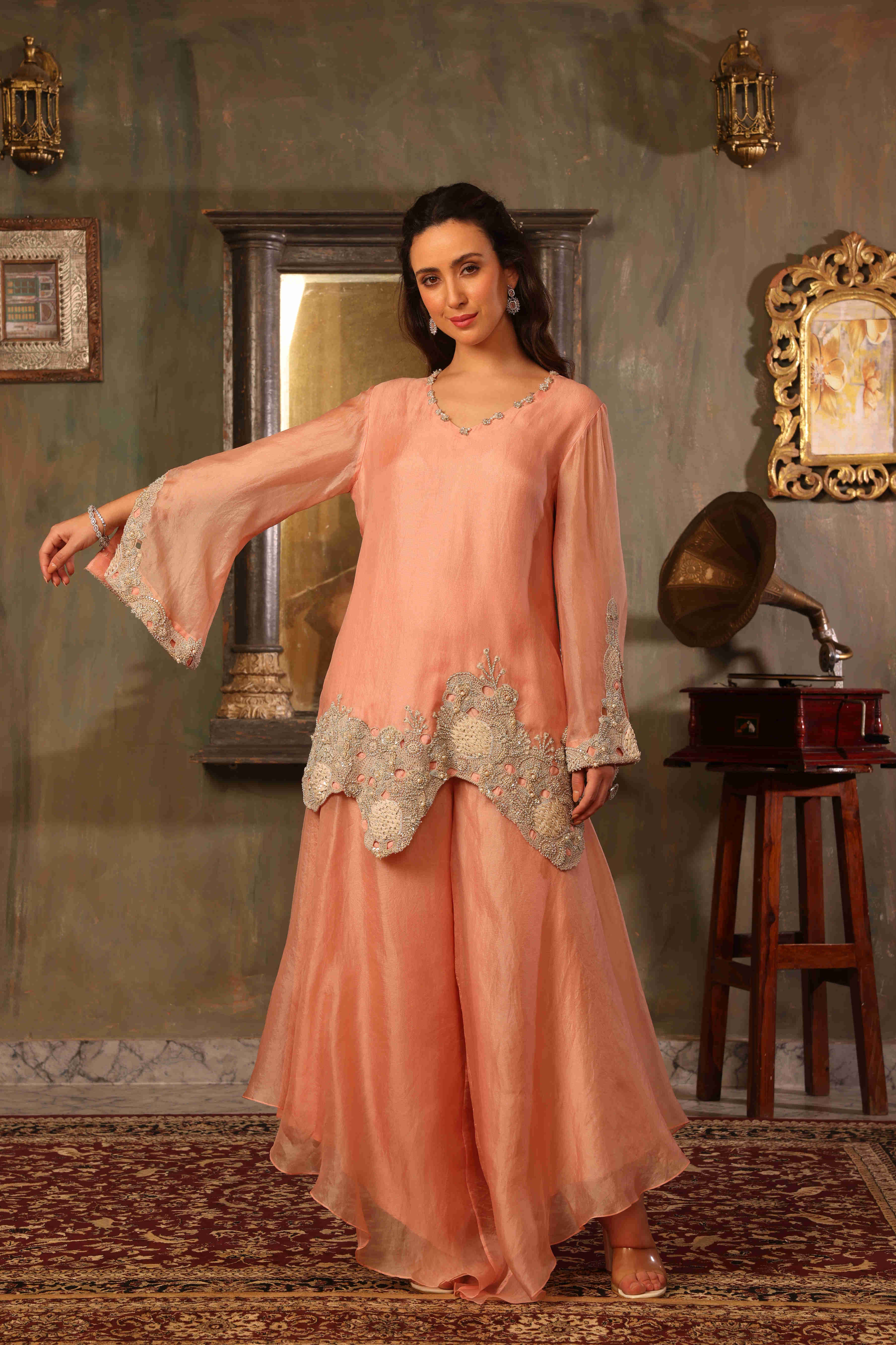 This elegant coord set is crafted in pure organza, featuring a fluid silhouette that feels light, graceful, and effortlessly refined. The kurta showcases a beautifully scalloped embroidered hemline, adding depth and artisanal charm to the design. Intricate hand embroidery highlights the hem and sleeve edges, celebrating fine craftsmanship. Paired with asymmetrical-cut pants, the silhouette brings a contemporary edge while maintaining softness and movement. Rendered in a delicate soft peach blush tone, this ensemble is perfect for intimate festivities and elegant daytime occasions.