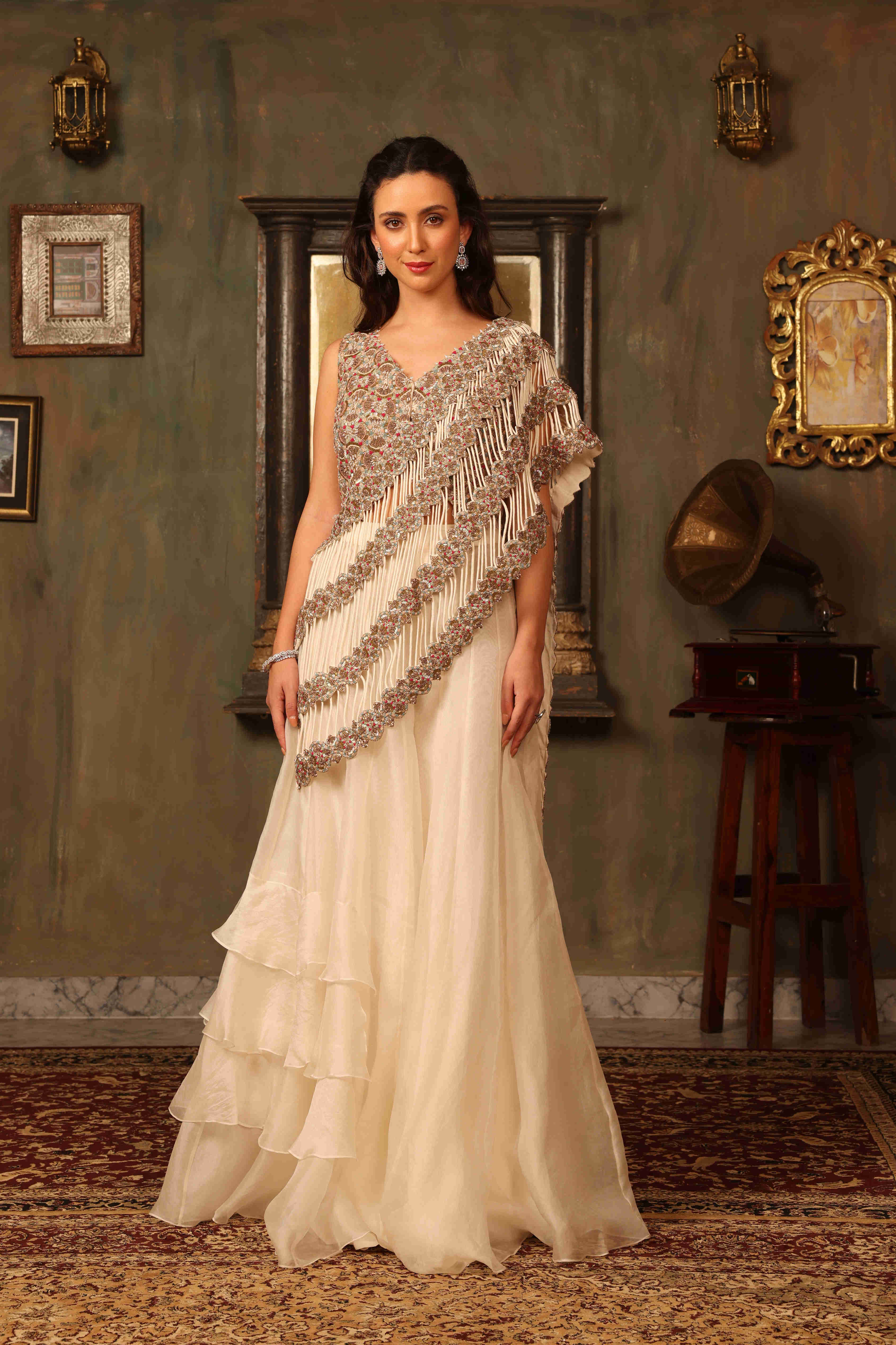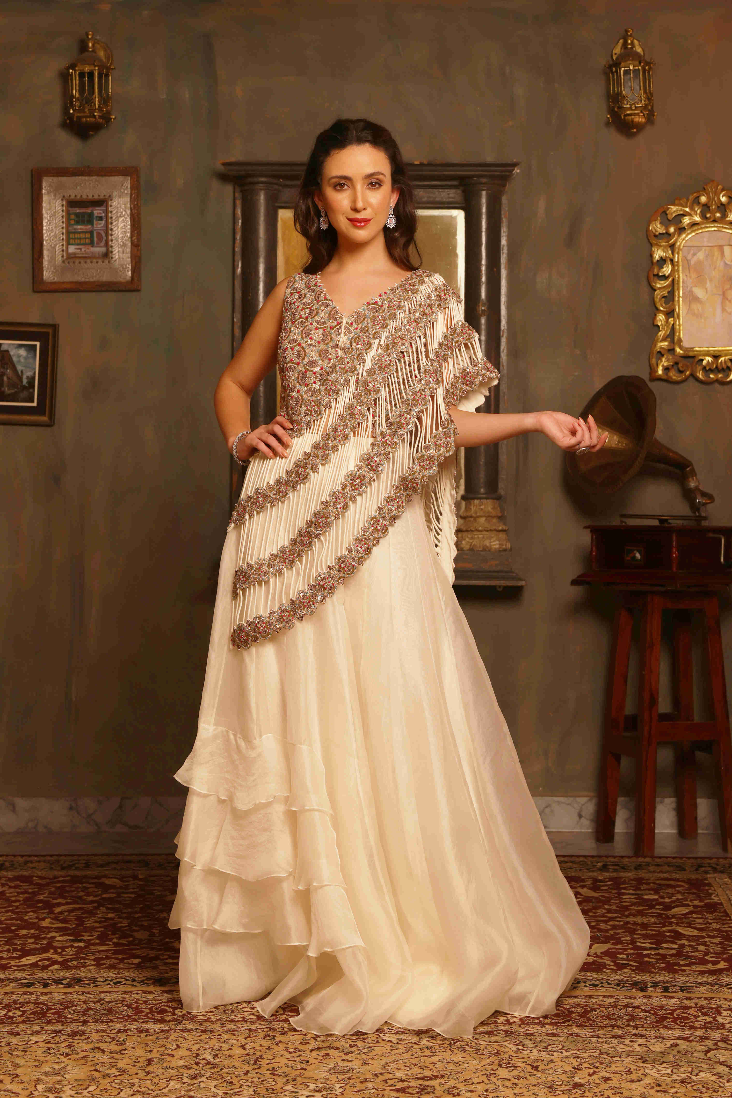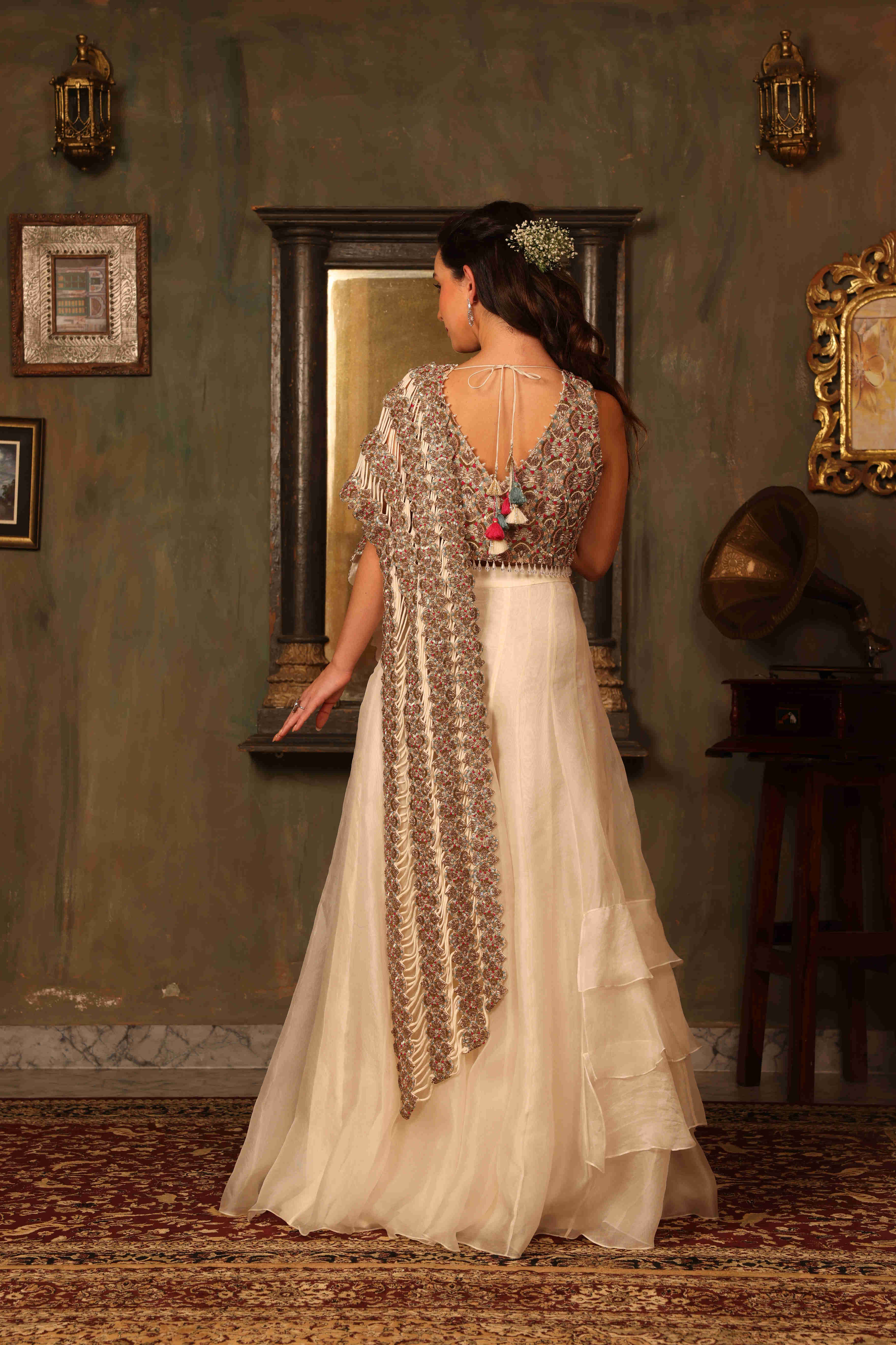 This off-white ruffle sharara set, crafted in pure organza, embodies soft elegance and timeless charm. The sharara features a one-side ruffle and is paired with a fully hand-embroidered blouse highlighted with delicate kardana detailing and intricate craftsmanship. The look is completed with a dori palla, richly hand-embroidered to add texture, depth, and a graceful flow to the ensemble. A refined creation for those who appreciate fine hand embroidery, luxurious fabrics, and understated sophistication.