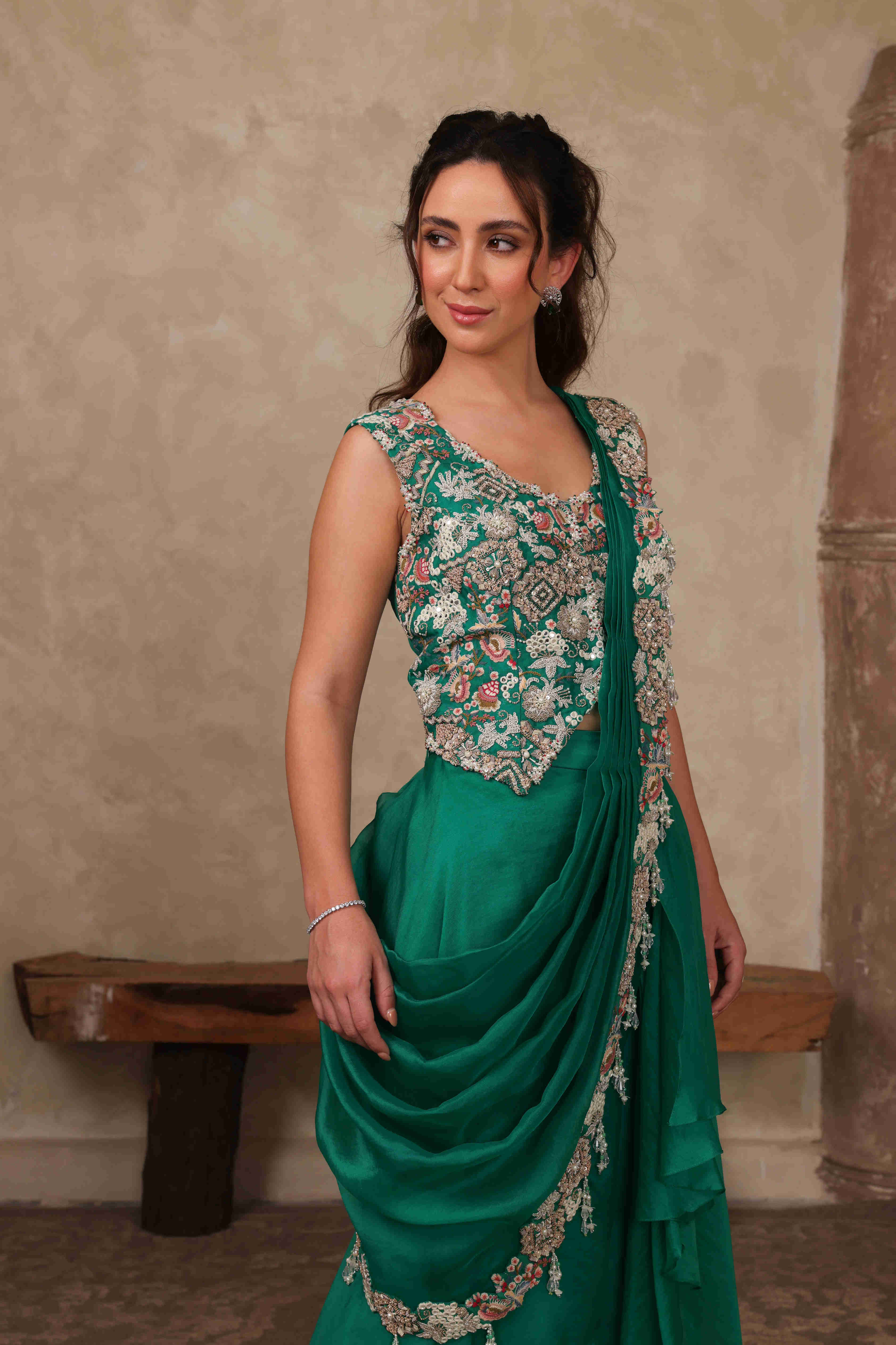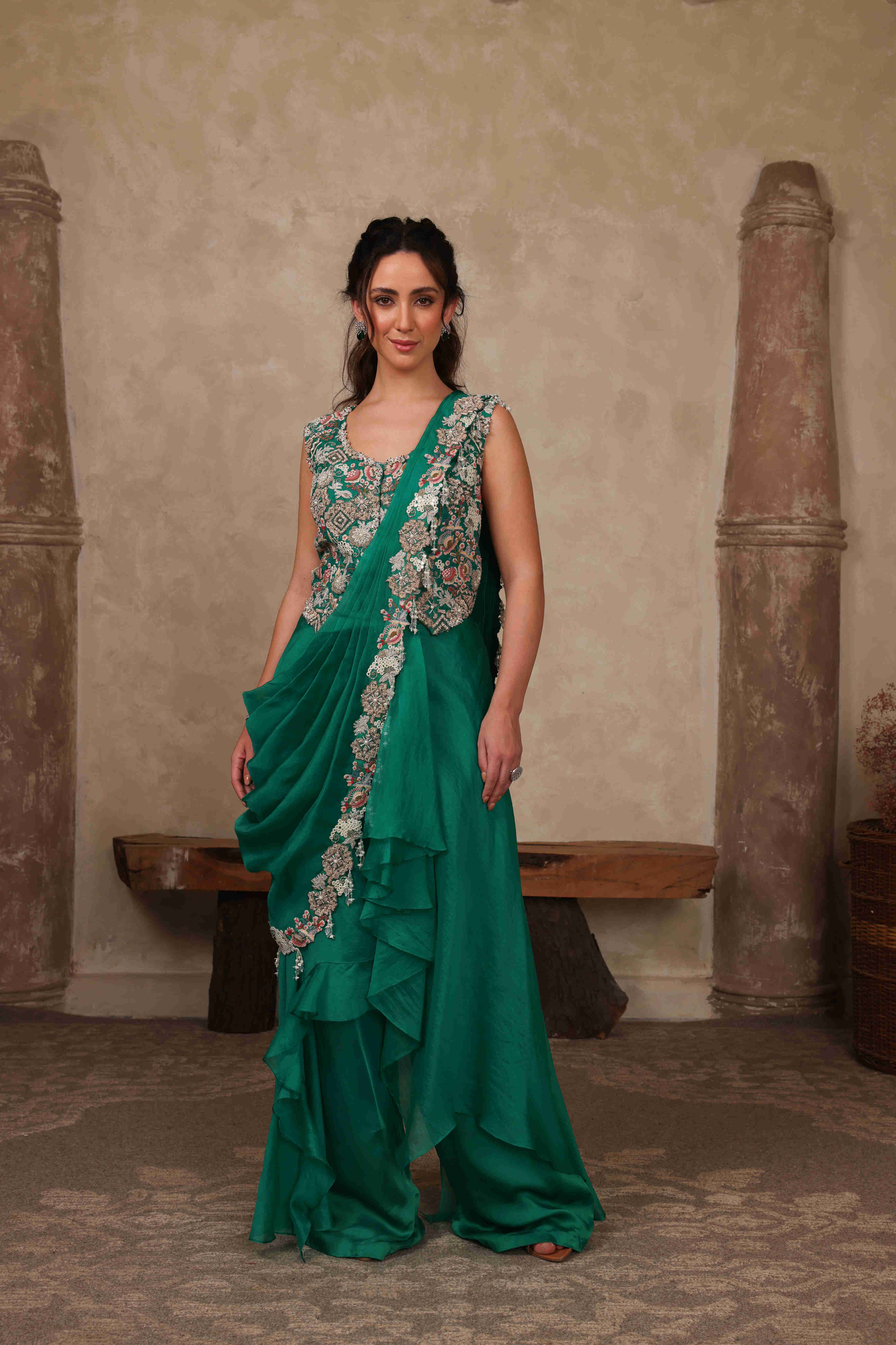 This elegant drape saree pant set is crafted in a rich emerald green organza, celebrated for its fluid fall and soft, graceful movement. The fully hand-embroidered blouse features intricate detailing that adds depth and artisanal richness to the silhouette. The embroidered drape flows seamlessly over the pant, creating a contemporary saree-inspired look with a refined, sculpted cut. Thoughtfully designed to enhance movement while maintaining structure, this ensemble strikes a perfect balance between modern tailoring and timeless craftsmanship. Ideal for cocktail evenings, festive occasions, and intimate wedding celebrations, this piece embodies effortless elegance and understated luxury.