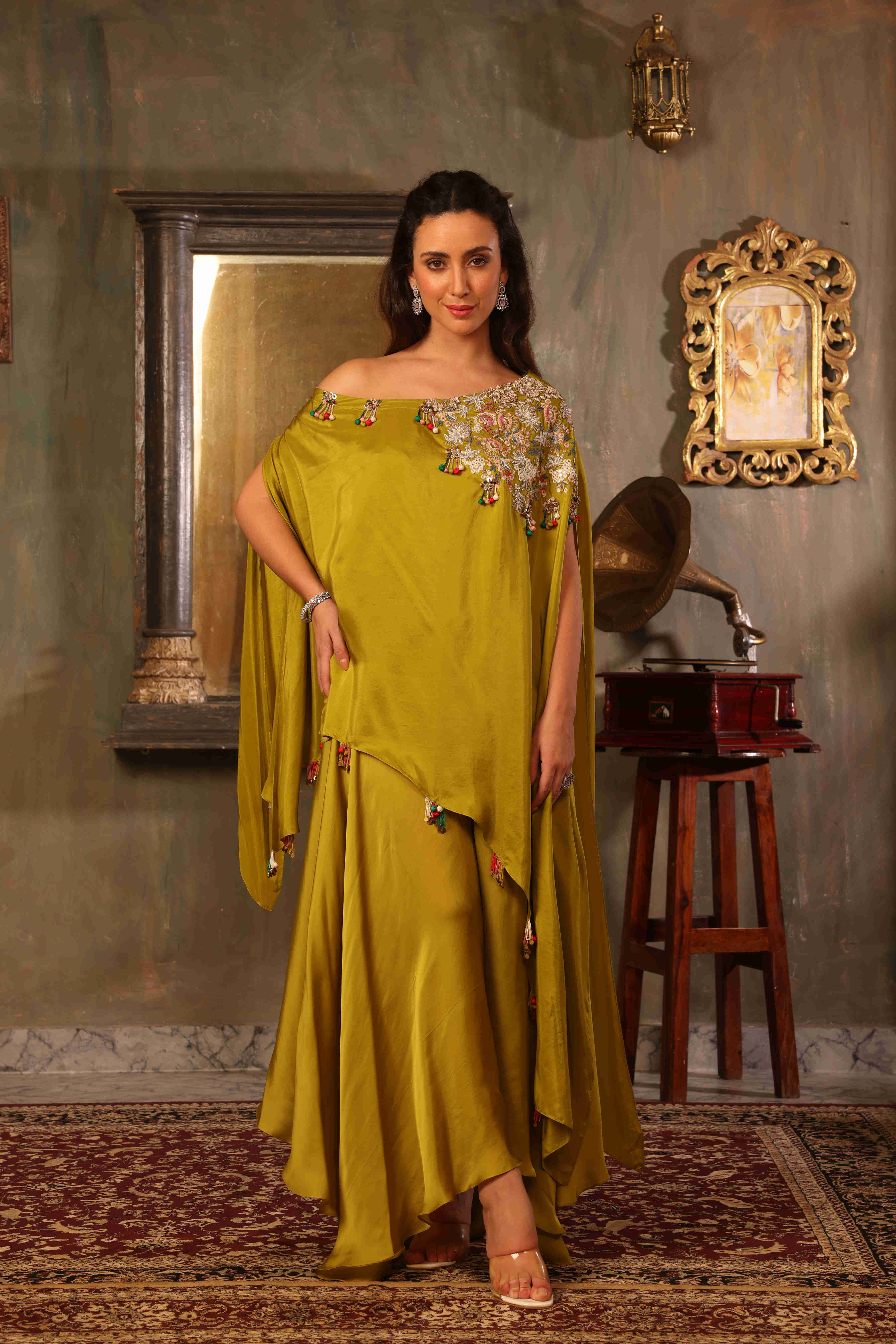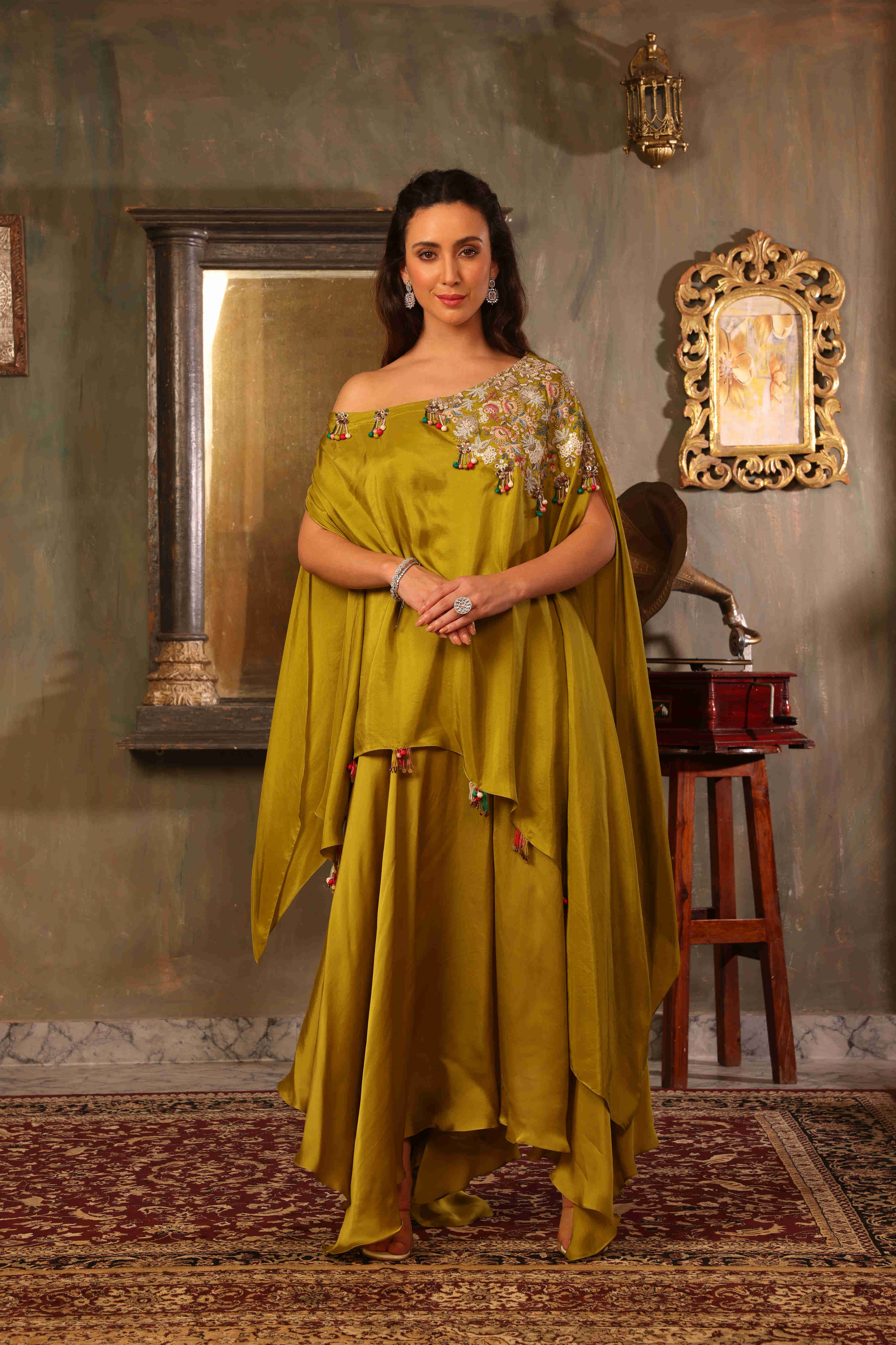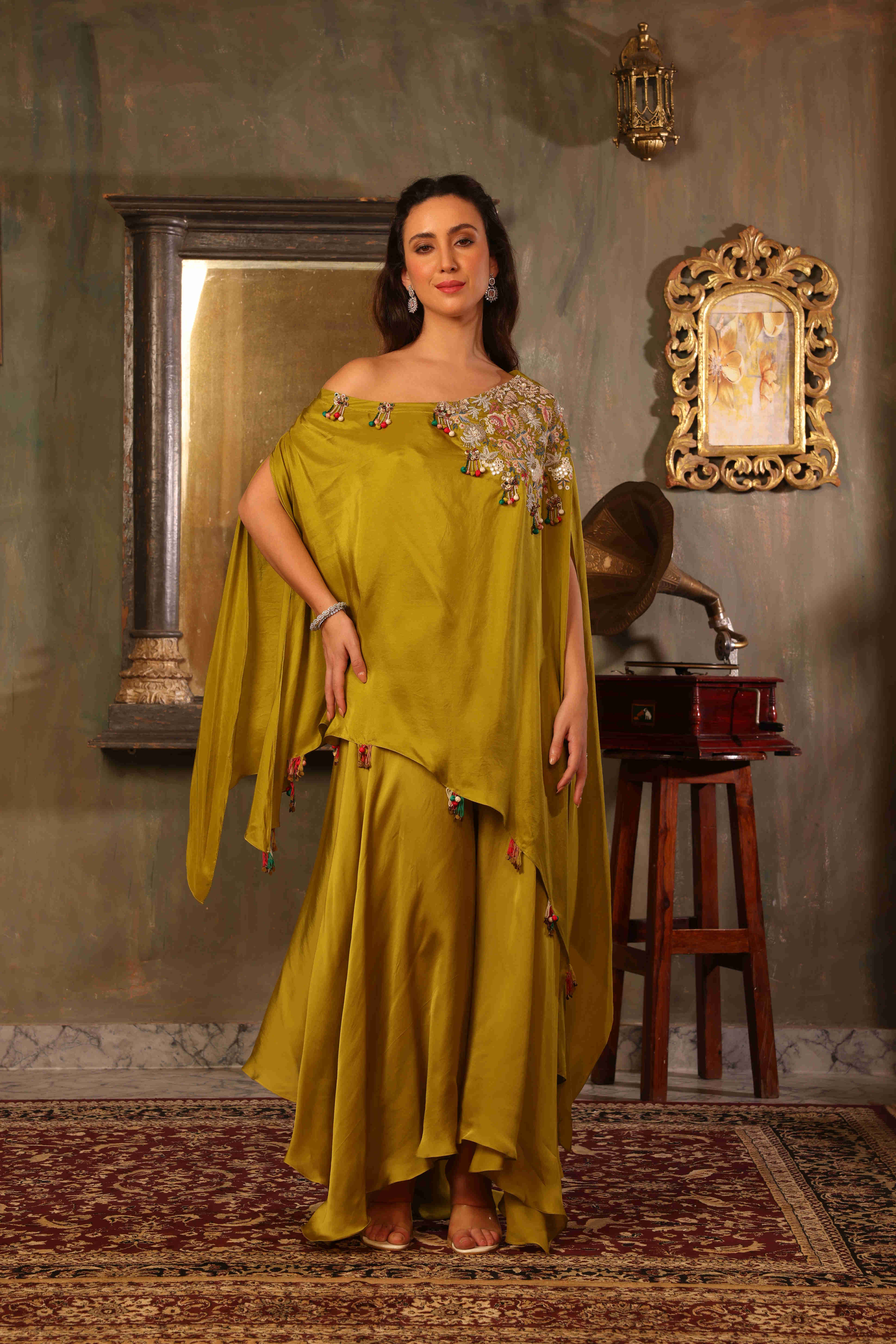 This elegant ensemble features an off-shoulder cape paired with fluid draped pants, creating a refined yet contemporary silhouette. Crafted in luxurious pure silk satin, the fabric offers a rich sheen and effortless movement. The soft olive green hue adds depth and understated sophistication to the look. Delicate handcrafted accents along the cape enhance its artisanal charm without overpowering the design. Perfect for festive evenings, intimate celebrations, or modern wedding gatherings.