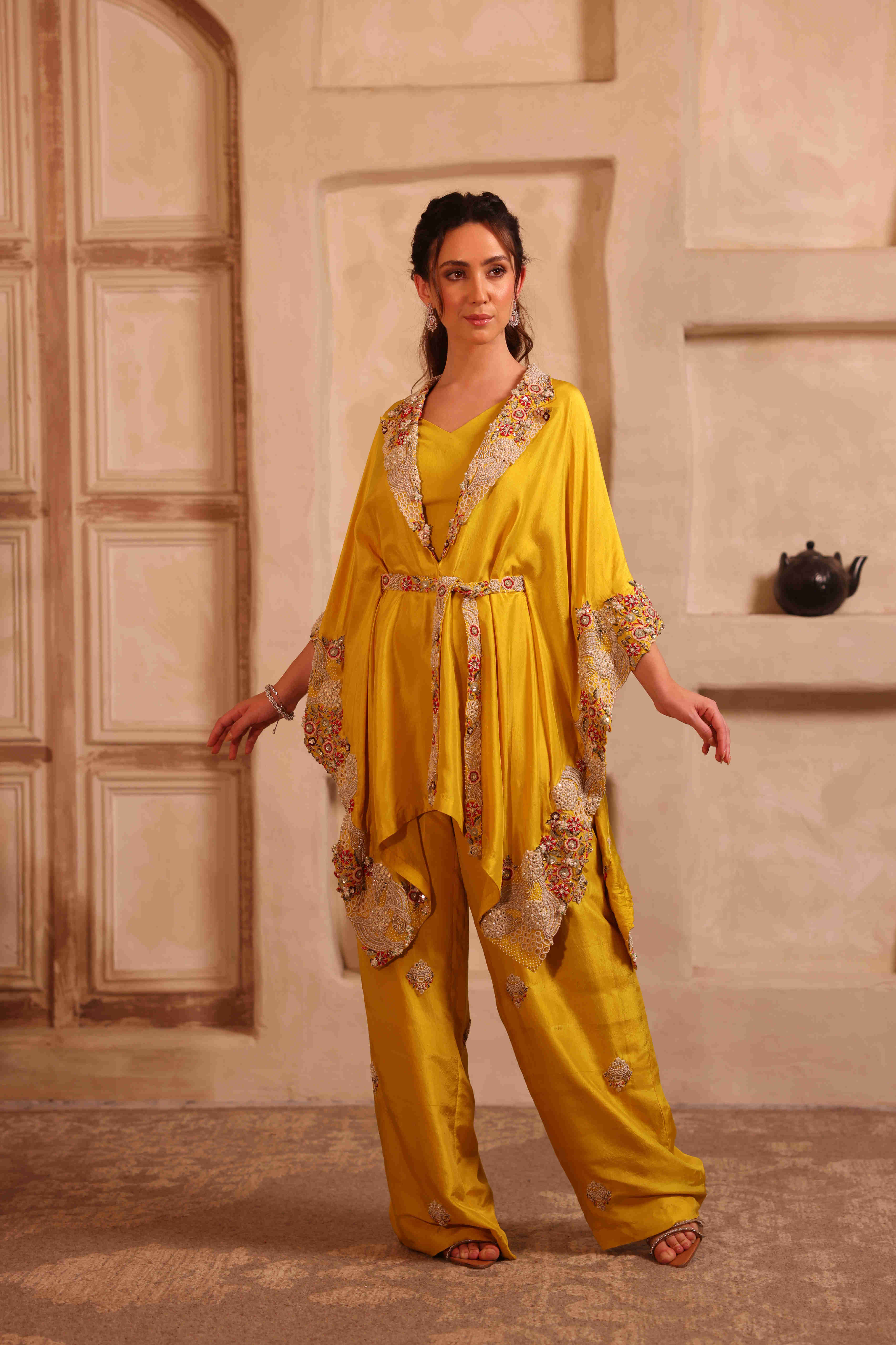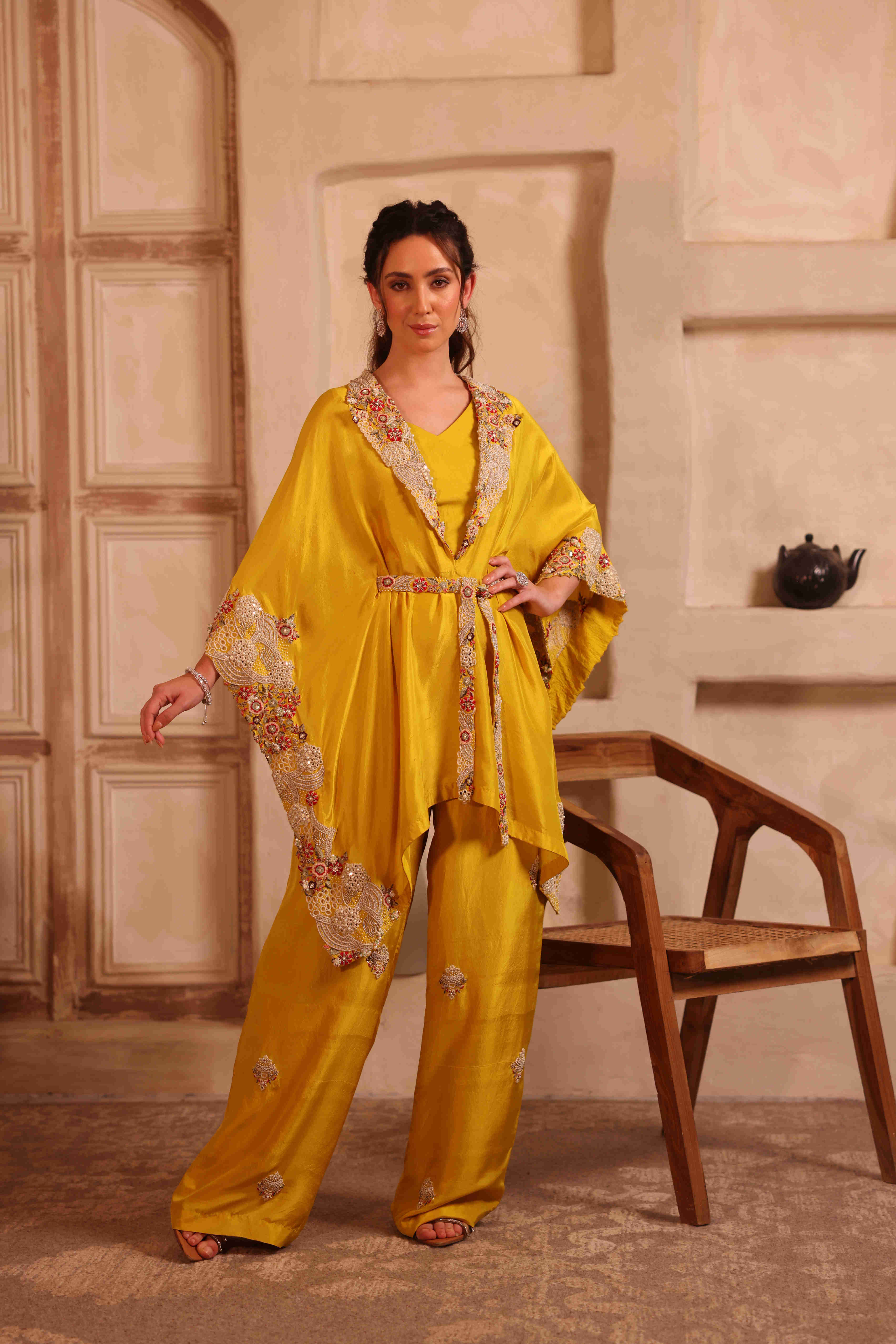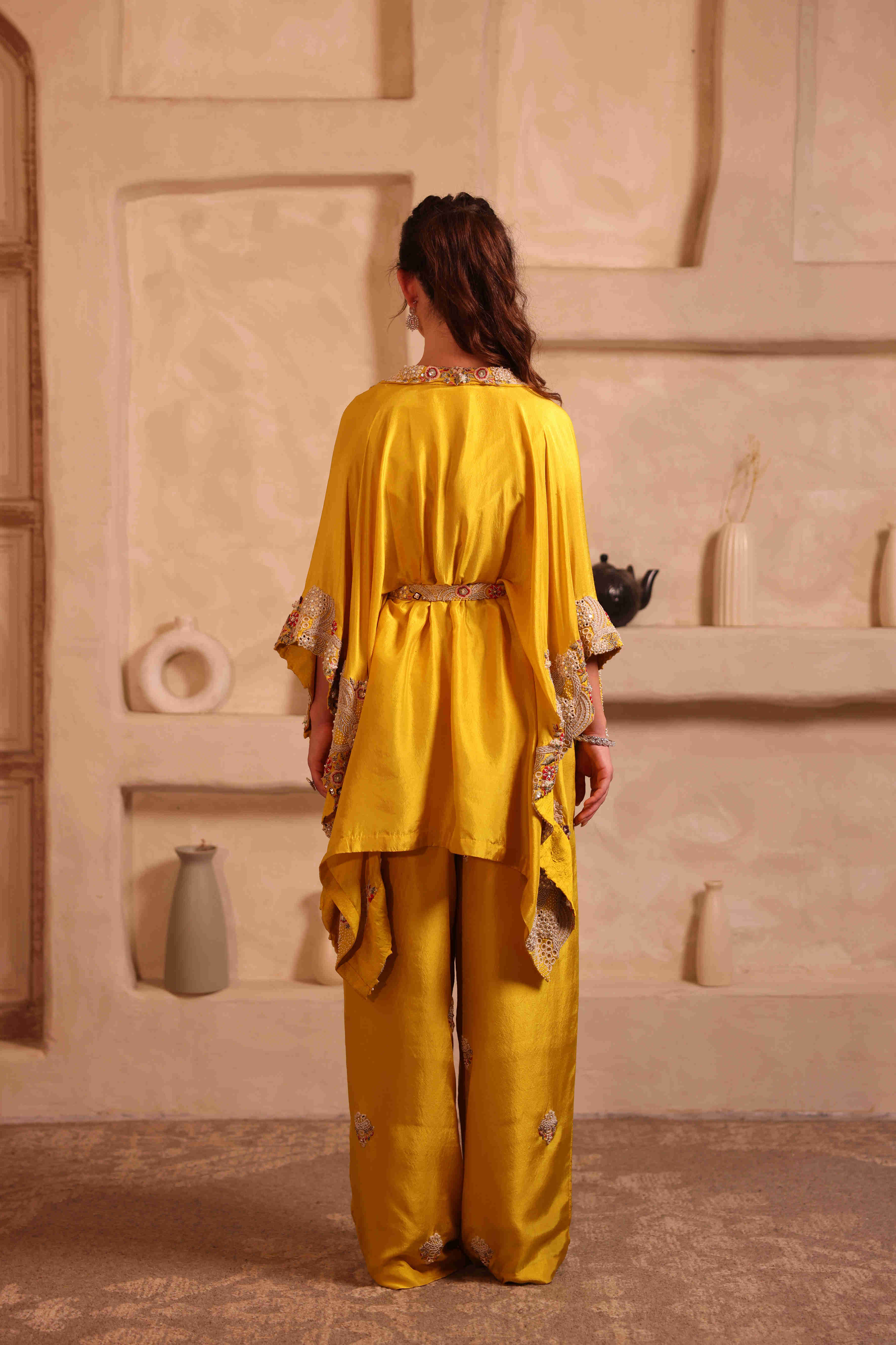 This mustard yellow four-piece set is crafted in pure silk, featuring a flowing kaftan, blouse, pants, and an embroidered belt. The kaftan is beautifully detailed with intricate free-hand embroidery along the collar and all four sides, adding a refined artisanal touch. The fully hand-embroidered belt cinches the silhouette elegantly, enhancing the overall look. The pants are finished with delicate embroidered booties, completing this sophisticated and timeless ensemble.